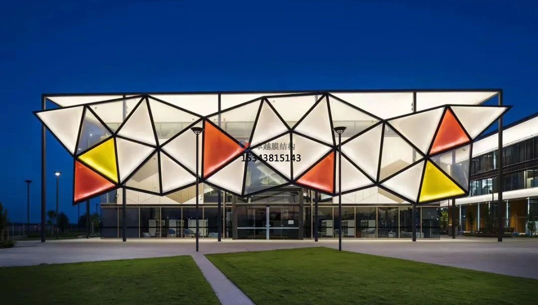 新的OranPark圖書館外立面,由31個(gè)三角形氣枕組成,氣枕設(shè)計(jì)成四種顏色:紅色,黃色,白色以及透明鍍點(diǎn),以此滿足不同部位室內(nèi)環(huán)境對(duì)陽(yáng)光的需求。背面均采用透明ETFE膜,此外還增加了LED照明系統(tǒng),為夜間增加不同的視覺效果。
