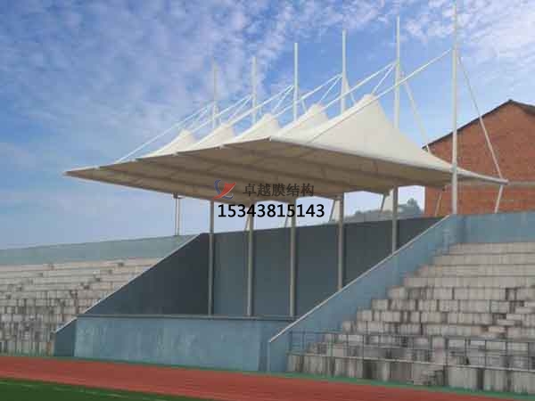 膜結(jié)構(gòu)在體育設(shè)施上主要應(yīng)用在學(xué)校操場運(yùn)動(dòng)看臺(tái)或主席臺(tái)屋頂 ,另外大型體育場館看臺(tái)膜結(jié)構(gòu)屋頂也屢見不鮮。 一般看臺(tái)造型都是由貝殼形峰膜及端部張拉膜組成,形式新穎活潑。鋼架、索、膜巧妙結(jié)合,通過薄膜、膜邊索、脊索、谷索、拉索、拉桿及一 定的格構(gòu)梁來穩(wěn)定。膜頂平滑過渡,結(jié)構(gòu)美觀、輕巧、整體造型相互輝映,別具一格。