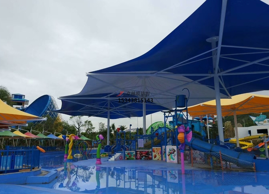 水上樂園遮陽棚所使用的膜材自重更輕,而且膜結(jié)構(gòu)是依靠支柱,拉索,與膜面形成了預張力成型的,這就使得整個結(jié)構(gòu)非常的簡單,特別是在游泳池這種大跨度的設(shè)施上使用,具有天然的優(yōu)勢。不僅能夠提供更大的遮陽面積,而且由于質(zhì)地更輕安全性也更高。